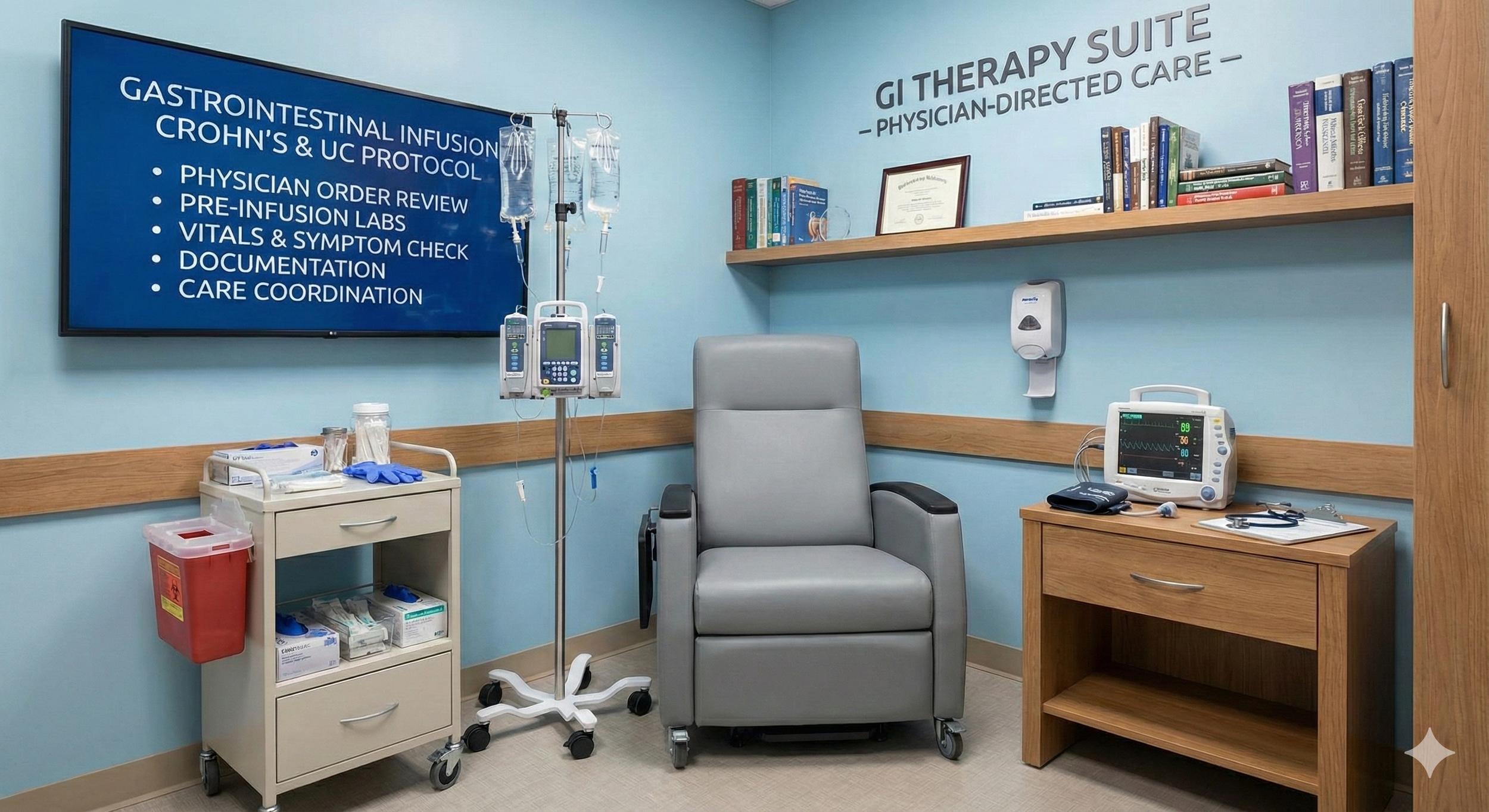Our GI infusion workflow follows physician-directed protocols for IBD therapies—ensuring referral accuracy, required screenings/labs, medication verification, and patient education before each visit. Nurses monitor vitals, comfort, and symptoms throughout treatment, document response, and manage infusion reactions using standardized steps. We coordinate with gastroenterology offices for ongoing plan adjustments, missed-dose recovery, and timely clinical reporting to keep patients stable and consistent with therapy.