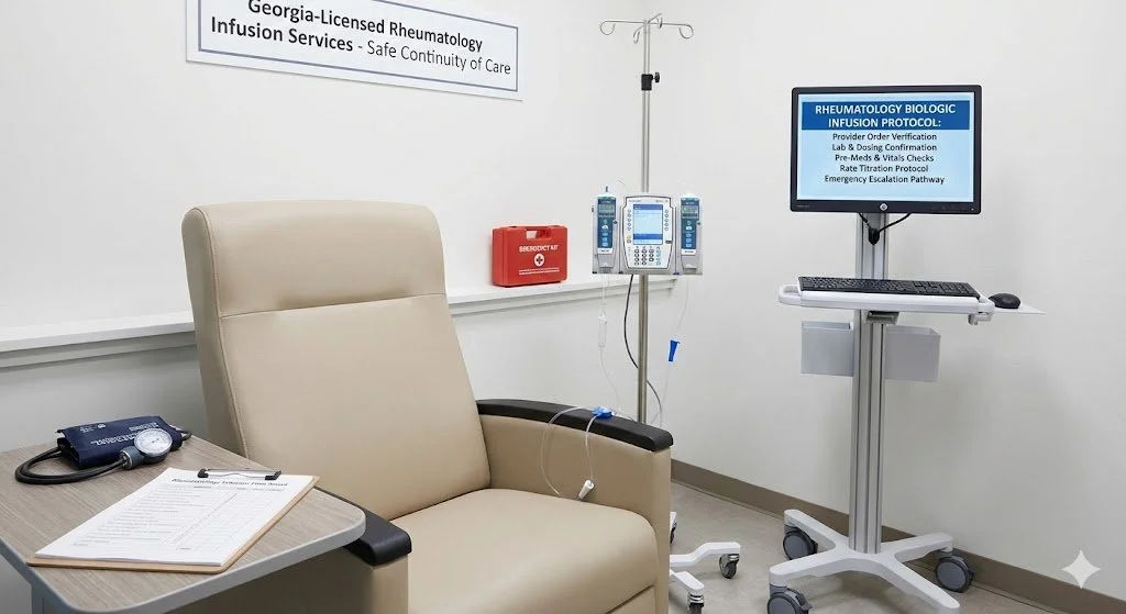 Our Georgia-licensed infusion nurses deliver rheumatology biologic infusions strictly per provider orders—screening history, verifying labs, confirming dosing, and administering pre-meds as indicated. We perform baseline and interval vital checks, titrate infusion rates per protocol, and respond to reactions with a defined escalation pathway and emergency readiness (supplies, meds, and transfer procedures). We coordinate updates with rheumatology teams to support safe continuity of care.
