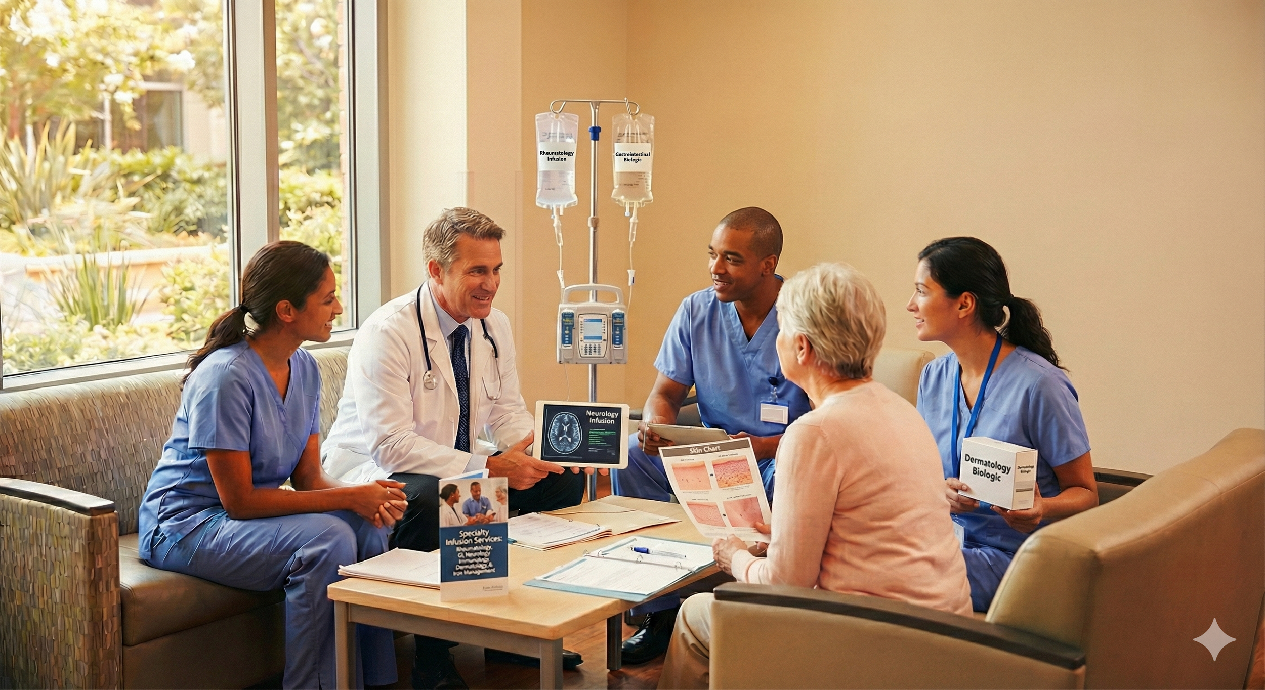Our care model is built for physician trust and payer credibility, focused on safe infusion protocols, attentive clinical monitoring, and streamlined coordination with referring providers to keep patients on schedule. We treat a broad range of conditions, including rheumatoid arthritis, psoriatic arthritis, ankylosing spondylitis, lupus, vasculitis, Crohn’s disease, ulcerative colitis/IBD, multiple sclerosis, NMO, myasthenia gravis, CIDP, immune deficiency disorders, psoriasis, and iron deficiency anemia.