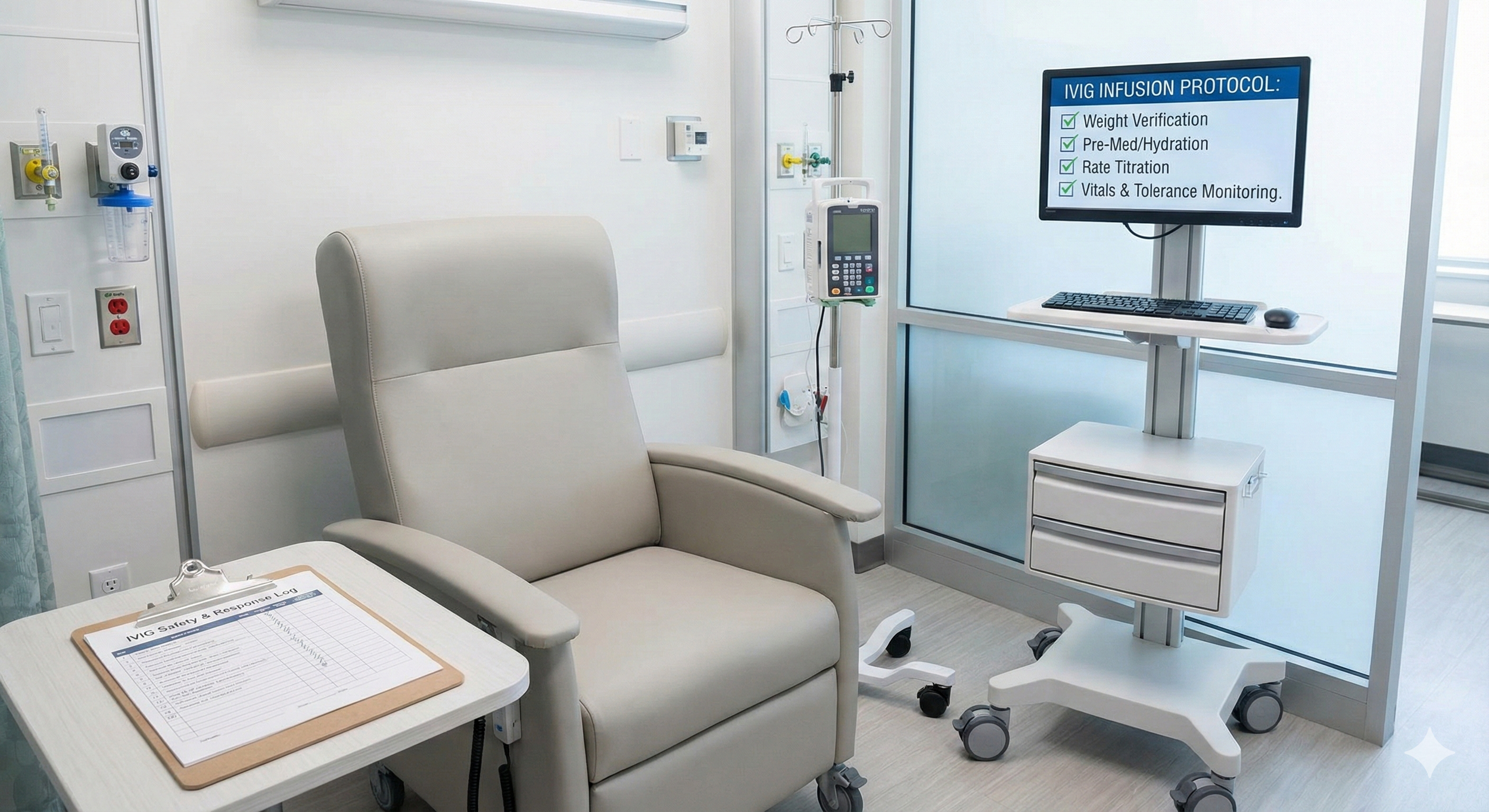 Our IVIG process is built around precise verification and safety: weight-based dosing confirmation, infusion rate titration per protocol, hydration/premed support as ordered, and close monitoring for tolerance. Nurses document vitals and patient response at scheduled intervals and follow an escalation pathway for adverse reactions. We coordinate with immunology teams on lab requirements, scheduling cadence, and post-infusion notes to support consistent immune therapy management.