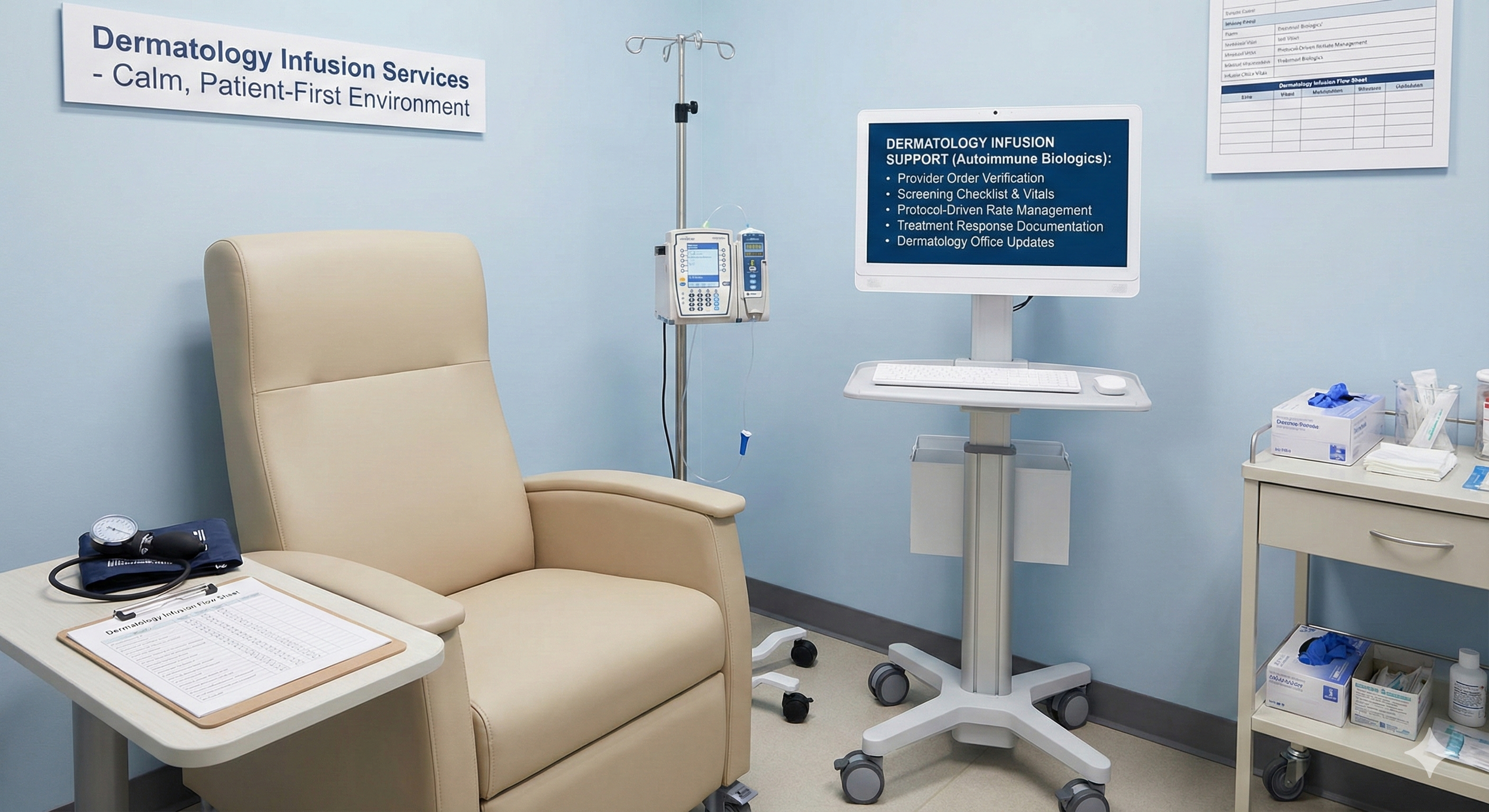 We support systemic biologic therapy for autoimmune dermatologic conditions through a clinic-based infusion workflow grounded in provider orders and standardized monitoring. Each visit includes medication verification, screening checklist review, and vitals monitoring with protocol-driven rate management. Our team documents treatment response and side effects, then shares structured updates with dermatology offices to keep therapy on track while maintaining a calm, patient-first infusion environment.